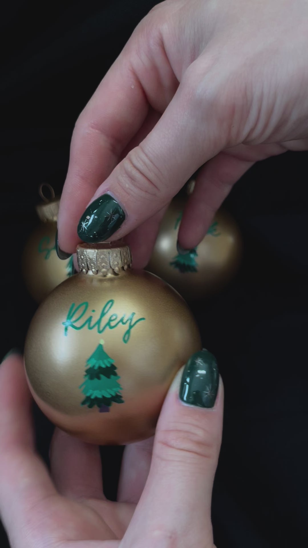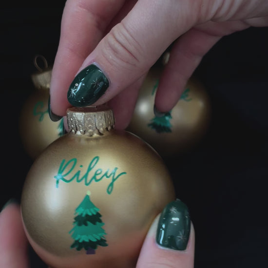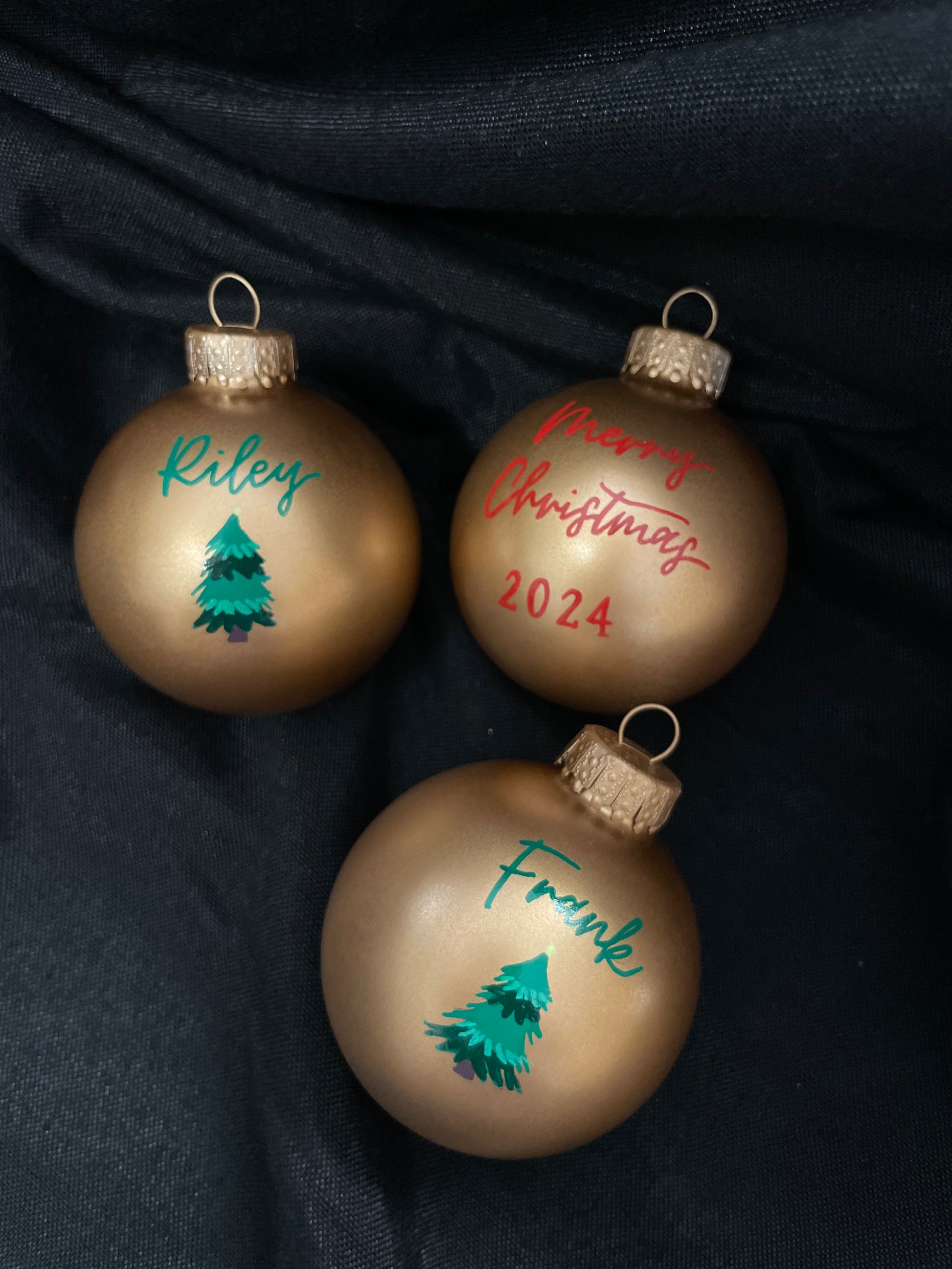 Carefully hand-lettered on a 2.5" glass gold ball, these ornaments are the perfect addition to your holiday decor. One side features "Merry Christmas 2024", while the other can be customized with the name of your choice. Each ornament also includes a charming Christmas tree drawing and comes packaged in a brown box for safe keeping. Elevate your tree this season with these unique and personalized ornaments.